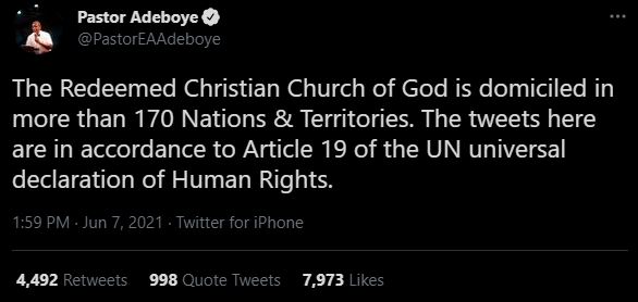 In a series of tweets on his personal twitter handle, Adeboye wrote; “The Redeemed Christian Church of God is domiciled in more than 170 Nations & Territories. The tweets here are in accordance to Article 19 of the UN universal declaration of Human Rights.”