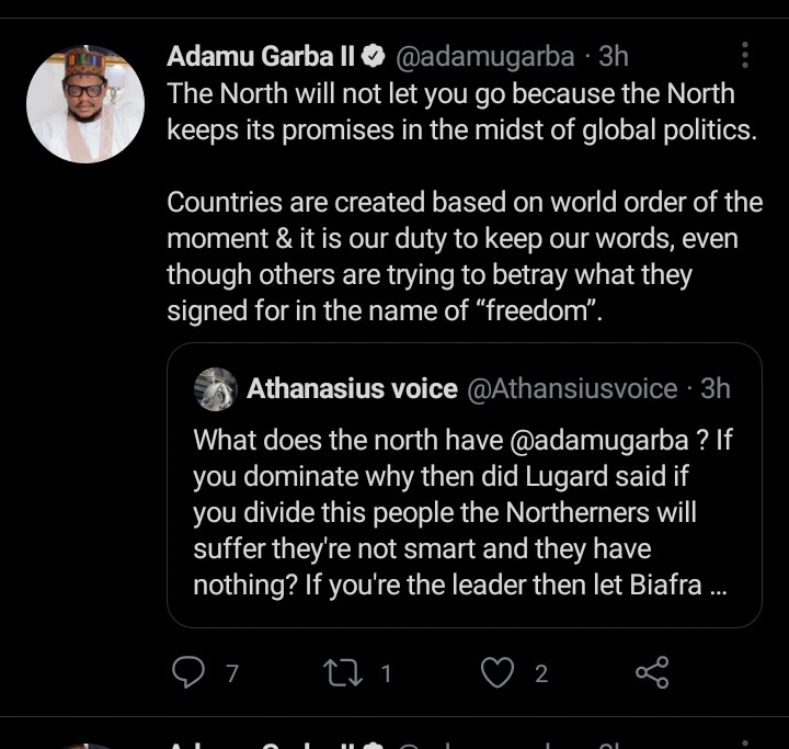 “What does the north have @adamugarba? If you dominate why then did Lugard said if you divide this people the Northerners will suffer they’re not smart and they have nothing? If you’re the leader then let Biafra go in peace. Why do you need our oil and us in your Nigeria? #Biafra