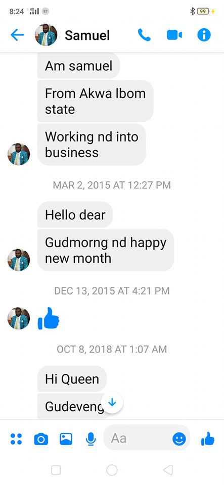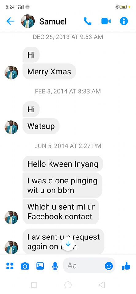 According to Obong-anwan, Samuel Usoro who has a photo of his family displayed as his cover photo on the social media platform has been in her inbox for years before trying to reach out to her via a video call while she was at wedding.