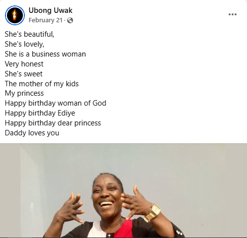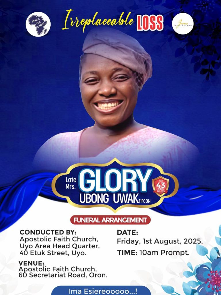 The deceased wife, Glory Ubong Uwak will be laid to rest on August 1, 2025 in Uyo, Akwa Ibom State.
