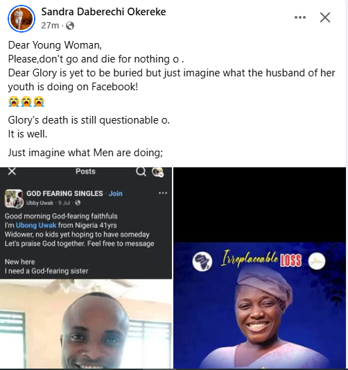Reacting to the post, a Facebook user, Sandra Okereke wrote: “Dear Young Woman. Please, don’t go and die for nothing o. Dear Glory is yet to be buried but just imagine what the husband of her youth is doing on Facebook! Glory’s death is still questionable o. It is well. Just imagine what Men are doing,”