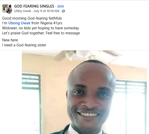 “Good morning God-fearing faithfuls. I’m Ubong Uwak from Nigeria, 41yrs. Widower, no kids yet hoping to have someday. Let’s praise God together. Feel free to message. New here. I need a God-fearing sister,” he wrote.