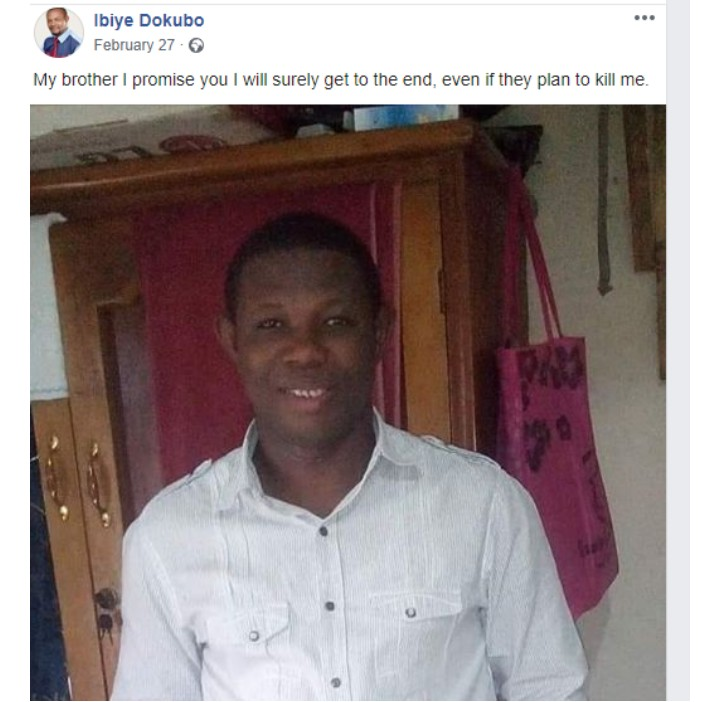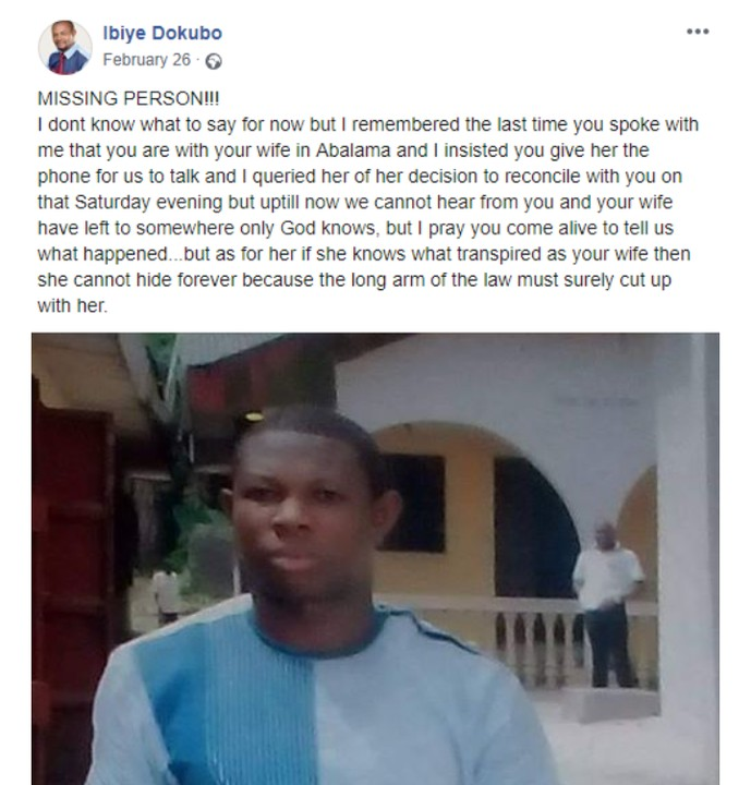 This is the wife of the missing man Mr. Tyger Inedukoba Charles, he was with her on Saturday before his sudden disappearance till date, they had issues because he impregnated another woman and up till now she had packed out of their rented apartment, she had transferred herself to an unknown LGA, she don’t pick her calls and she is hiding from the truth so please help me share this until we get her arrested or better still report her to any police station if you see her..thanks” Dokubo had written on his Facebook page on March 1st