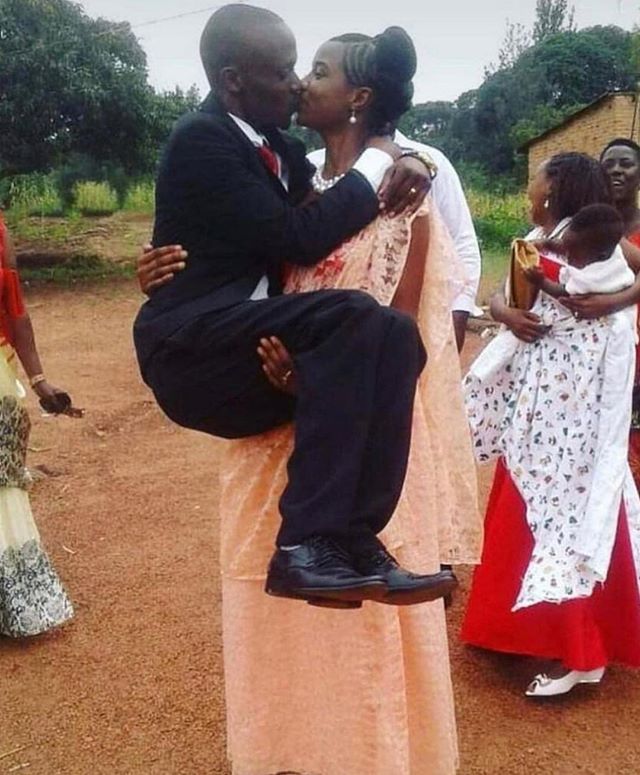 A tall wife was seen carrying her husband in a viral wedding photo as she kisses him with love and affection.
