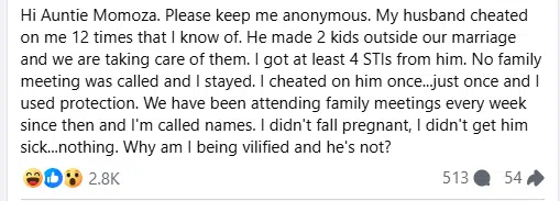 “Hi Auntie Momoza. Please keep me anonymous. My husband cheated on me 12 times that I know of. He made 2 kids outside our marriage and we are taking care of them. I got at least 4 STIs from him. No family meeting was called and I stayed. I cheated on him once…just once and I used protection. We have been attending family meetings every week since then and I’m called names. I didn’t fall pregnant, I didn’t get him sick…nothing. Why am I being vilified and he’s not?”