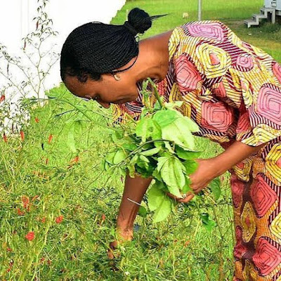 Wife of the Vice President, Mr Dolapo Osinbajo shared a photo of her picking vegetables from her garden. She captioned the photo: “We will produce what we eat” PMB. My backyard garden Abuja (planted after inauguration), gives us a constant supply of fresh vegetables. A handful of fresh Eweroko/ugu and dainty peppers today.”