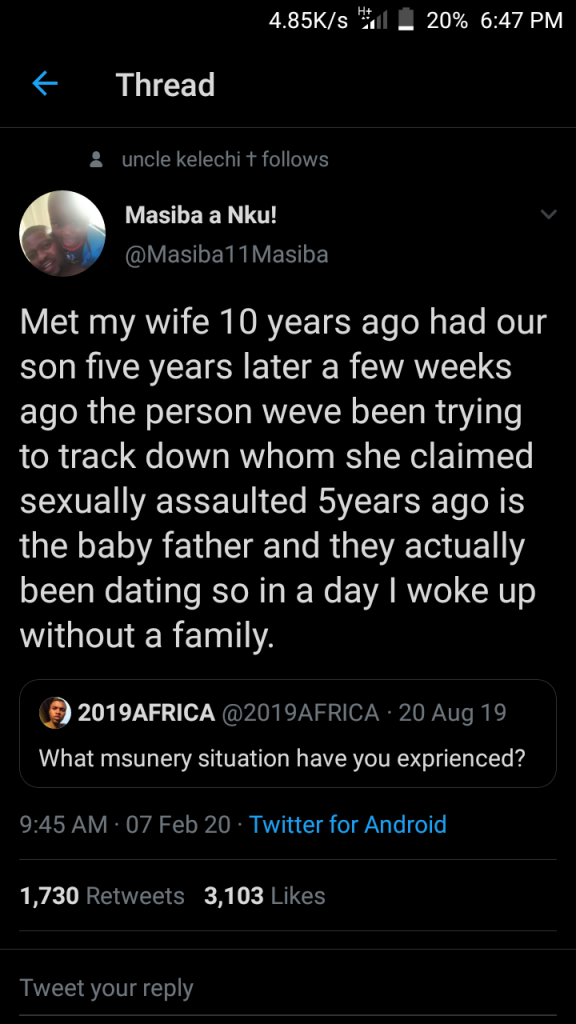 Met my wife 10 years ago had our son five years later a few weeks ago the person we’ve been trying to track down whom she claimed sexually assaulted her 5years ago is the baby father and they actually been dating so in a day I woke up without a family.