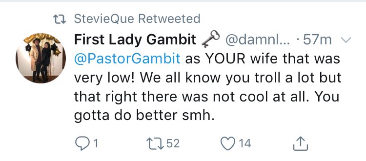 “@PastorGambit as YOUR wife that was very low! We all know you troll a lot but that right there was not cool at all. You gotta do better smh.”