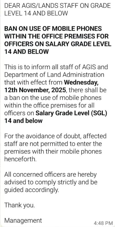 “There shall be a ban on the use of mobile phones within the office premises for all officers on Salary Grade Level (SGL) 14 and below. Affected staff are not permitted to enter the premises with their mobile phones henceforth,” the memo stated.
