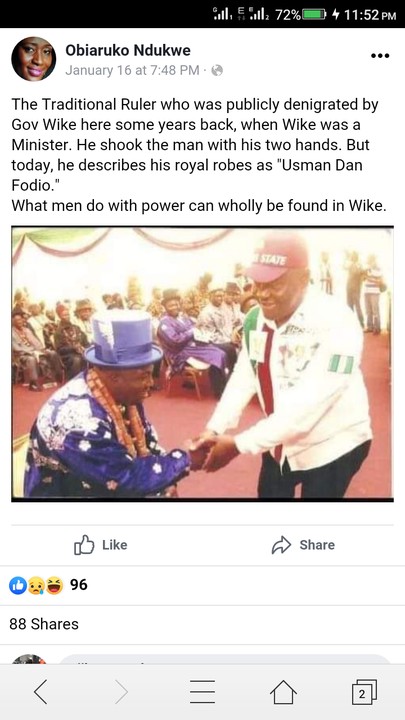 There are many things power can do. This is a throwback photo of Nyesome Wike, governor of Rivers State, shaking King Onyekachi Amaonwu of Omuma with two hands. Same man he embarrassed in public few days ago.