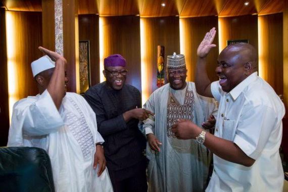 Rivers state governor, Nyesom Wike, his Sokoto state counterpart Aminu Tambuwal and Zamfara state governor Abdul’aziz Abubakar Yari, pictured having a great time with the Minister of Solid Minerals, Kayode Fayemi, at the National Economic Council meeting which is presently happening at the State House, Abuja.