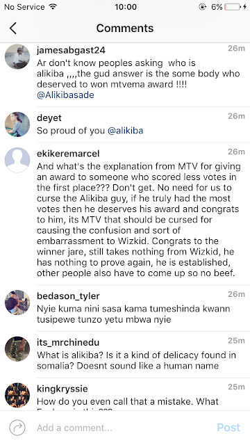 His fans are not happy about the news which some thinks MTV Europe awards are so unprofessional, however some thinks maybe Wizkid bought the award since it was stated that alikiba had more votes than the Ojuelegba crooner.
