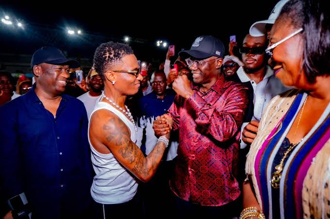 Nigerian superstar Ayodeji Ibrahim Balogun, popularly known as Wizkid, created a buzz at the Greater Lagos Countdown when he stepped down from the stage after his performance to greet Lagos State Governor, Babajide Sanwo-Olu. Fans erupted in excitement, with one shouting, “Come to your governor, bro!” as Wizkid made his way toward the governor.