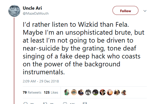 I’d rather listen to Wizkid than Fela. Maybe I’m an unsophisticated brute, but at least I’m not going to be driven to near-suicide by the grating, tone deaf singing of a fake deep hack who coasts on the power of the background instrumentals.