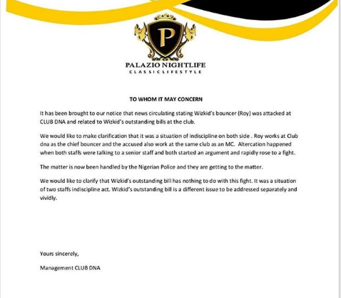 It has been brought to our notice that news circulating stating Wizkid’s bouncer (Roy) was attacked at CLUB DNA and related to Wizkid’s outstanding bills at the club.
