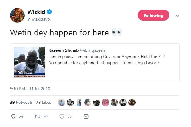 Singer Wizkid who’s currently in the US, Has also heard of the incident that Happened to Governor Fayose of Ekiti state today… And he has just reacted to it… He retweeted the video of Fayose speaking after he collapsed..