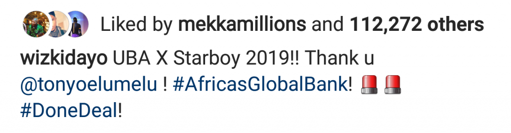 “UBA x Starboy 2019. Thank you!! @tonyelumelu #Africasglobalbank #donedeal”