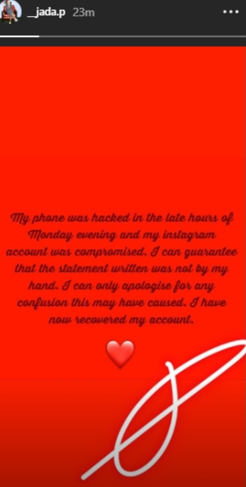 She wrote: “My phone was hacked in the late hours of Monday evening and my Instagram account was compromised. I can guarantee that the statement written was not my hand. I can only apologise for and confusion this may have caused. I have now recovered my account.”, See her post below; Wizkid’s management he declined to comment on the issue.