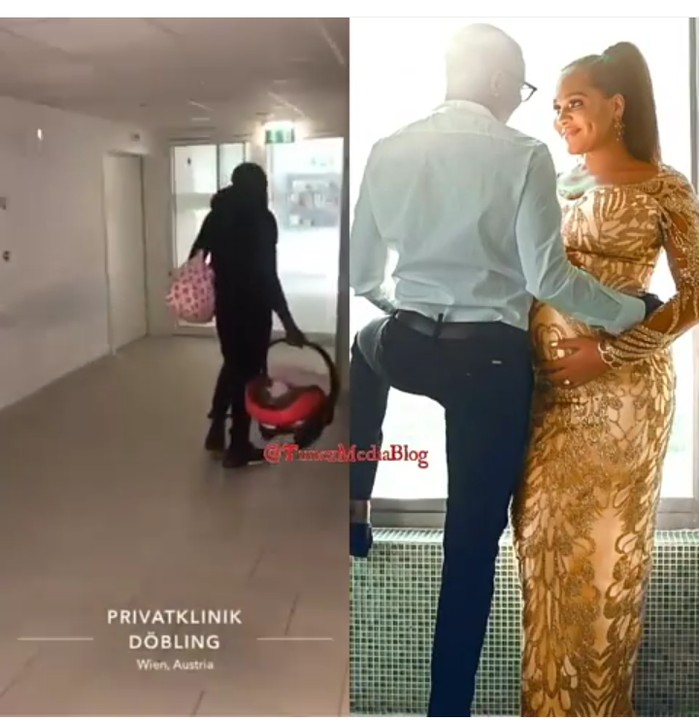 Popular model and fashion designer, Tania Omotayo with her newly welcomed daughter and her husband Sunmbo on their way home from Austria where the Ziva boss welcomed her patter of feet.