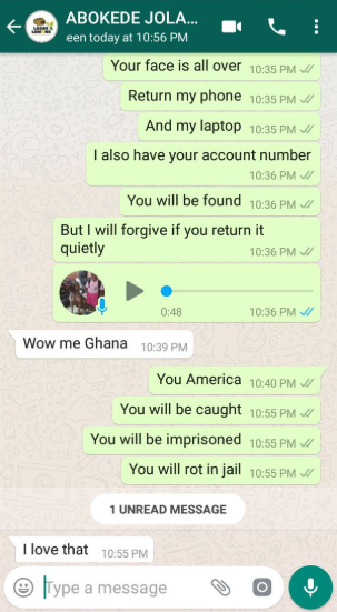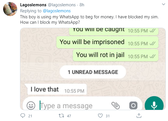 To make matters worse, he’s been using her WhatsApp to beg for money.