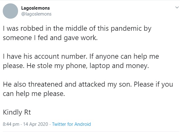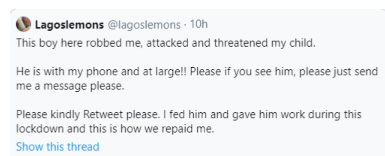 The Twitter user claims the boy stole a phone, laptop, and a huge sum of money from her home in Ketu Alapere, Lagos. He also allegedly attacked her son before he made away with the stolen items.