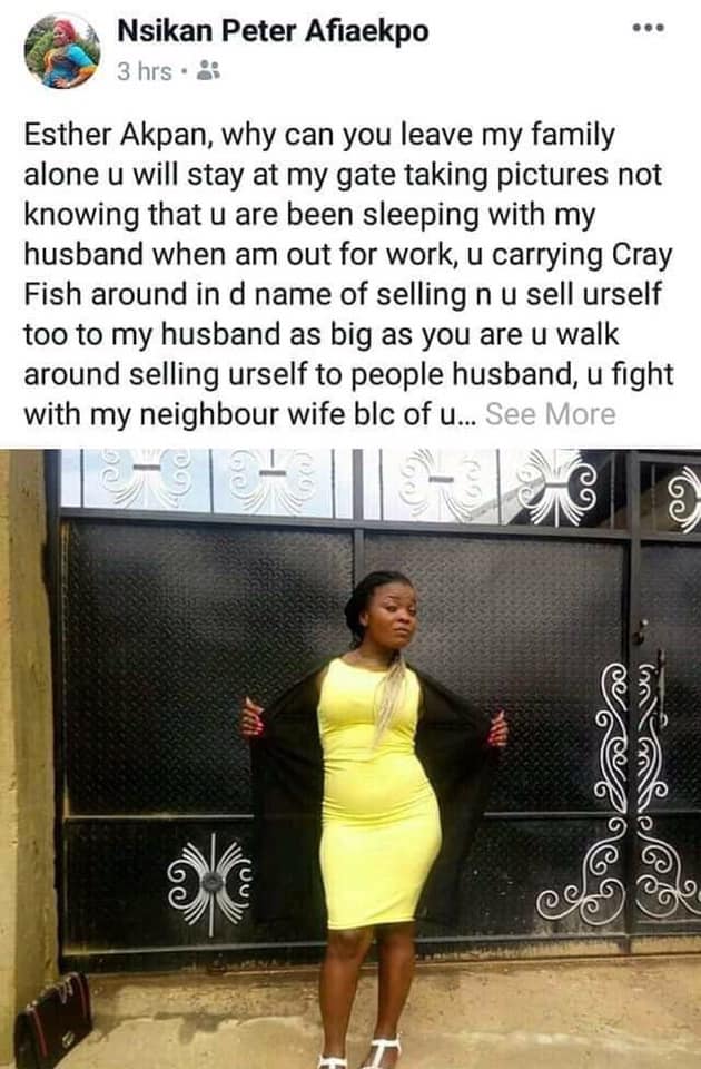 A Nigerian woman took to Facebook today to call out a lady who accused of sleeping with her husband, and also taking photos at their gate.According to the Nigerian woman, Nsikan Peter Afiaekpo, the lady she called out who is identified as Esther Akpan has been sleeping with her husband and taking photos at their gate while she is at work.