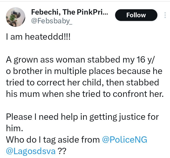 “I am heateddd!!! A grown woman st@bbed my 16 y/o brother in multiple places because he tried to correct her child, then stabbed his mum when she tried to confront her. Please, I need help getting justice for him. Who do I tag aside from @PoliceNG and @Lagosdsva?” she wrote.