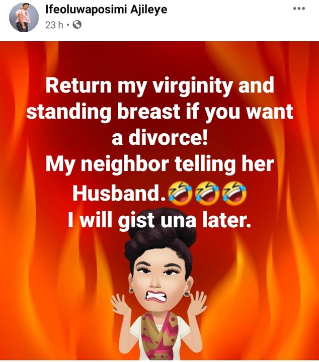 A Facebook user narrates how her married neighbour asked her husband to return her virginity and standing breasts in exchange for divorce.