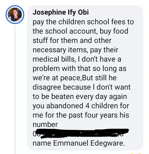“Pay the children’s school fees to the school account, buy foodstuff for them and other necessary items, pay their medical bills, I don’t have a problem with that so long as we’re at peace. But still, he disagrees because I don’t want to be beaten every day again. You abandoned 4 children for me for the past four years.”