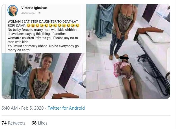 Sharing the sad photo, she wrote: “WOMAN BEAT STEP DAUGHTER TO DEATH,AT BORI CAMP.😧😧😧😢😢😢😢😢😢😢😢😢