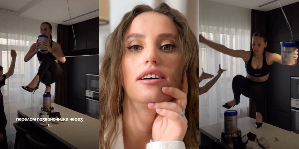 In a video she posted online, the woman, Mariana Barutkina, tried to perform a daring squat on a stack of unstable household items, a baby formula container placed on a sauce pot, all balanced on top of a kitchen counter.