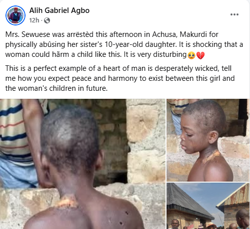“Mrs. Sewuese was arrested this afternoon in Achusa, Makurdi for physically abûsing her sister’s 10-year-old daughter. It is shocking that a woman could harm a child like this. It is very disturbing. This is a perfect example of a heart of man is desperately wicked, tell me how you expect peace and harmony to exist between this girl and the woman’s children in future,” he wrote.