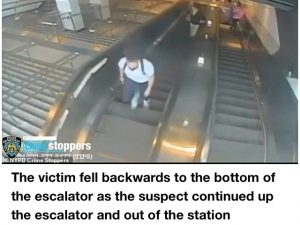 The victim fell backwards to the bottom of the escalator as the suspect continued up the escalator and out of the station.