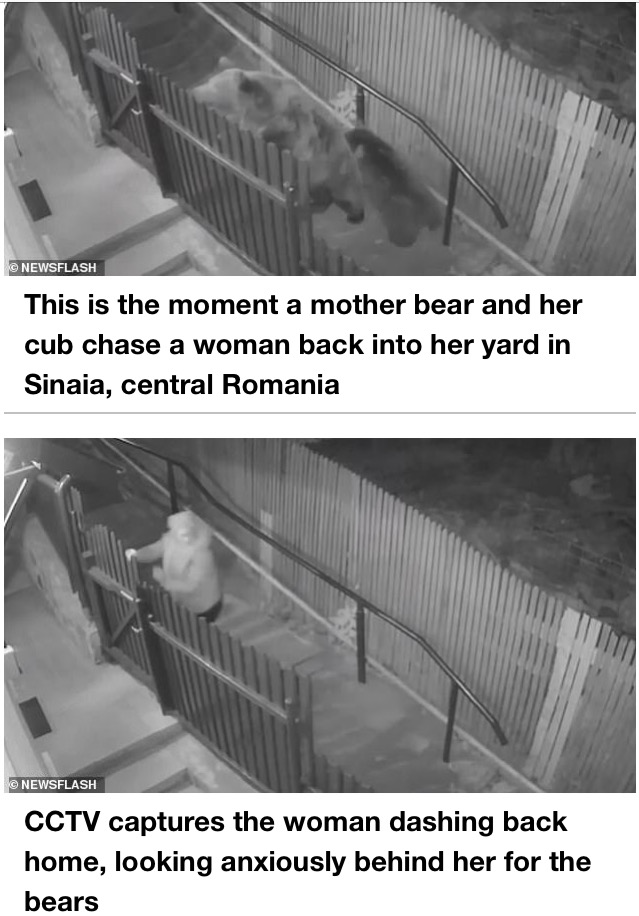 This is the terrifying moment a Romanian woman was chased by two bears after unwittingly following them down a dark alley at night.