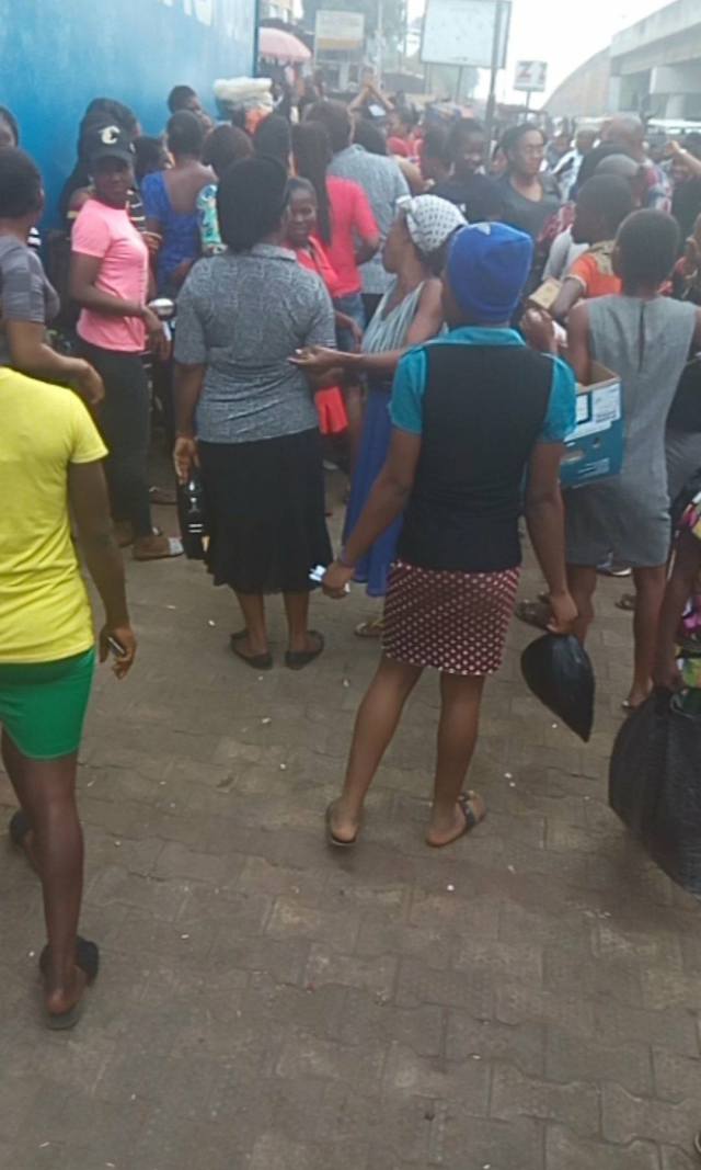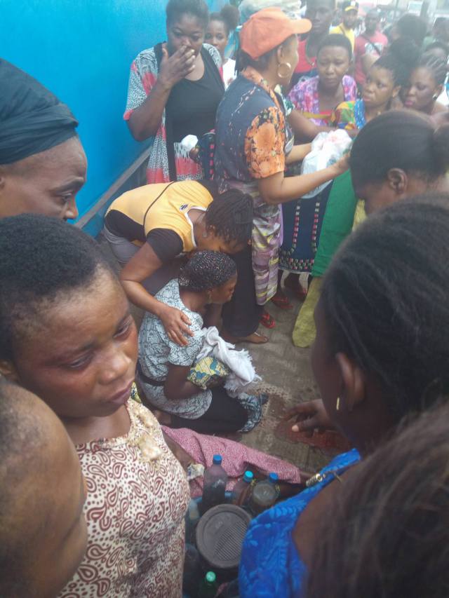 A yet to be identified woman, has according to new photos shared online, delivered a baby while selling her herbal drinks, this morning, in front of Atlantic plaza, Nkpor, Anambra State.