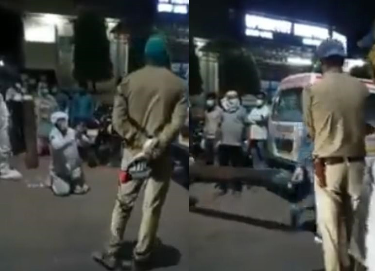 Video circulated on social media shows a man crying and begging officers on his hands and knees outside a private hospital in the city of Agra in Uttar Pradesh.