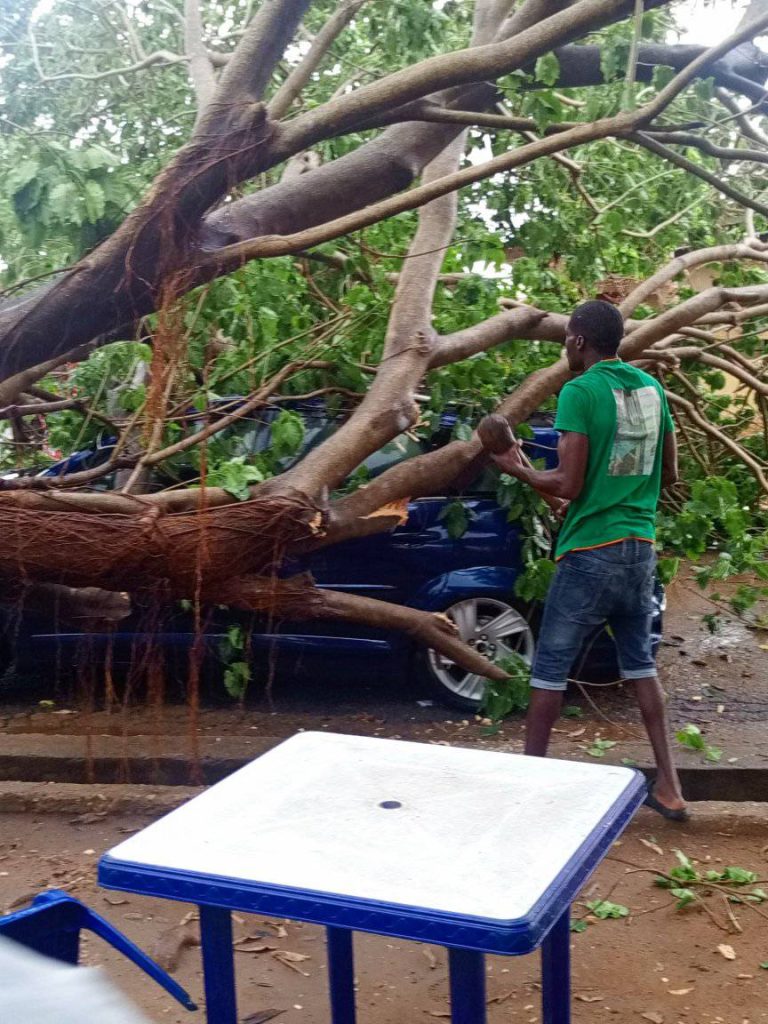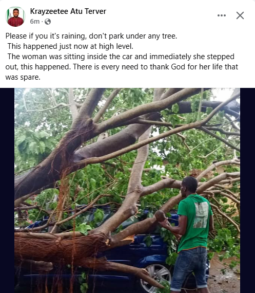 “Please if it’s raining, don’t park under any tree. This happened just now at high level. The woman was sitting inside the car and immediately she stepped out, this happened. There is every need to thank God for her life that was spared,” he wrote.