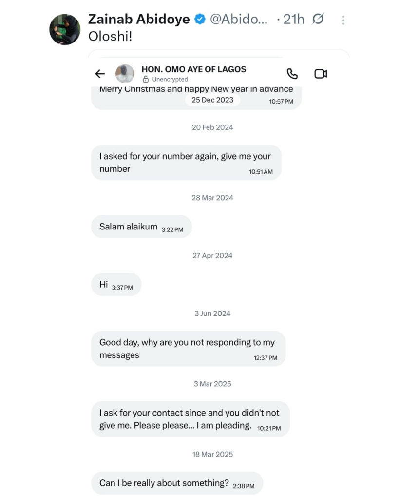 The woman in the abaya has now exposed his direct messages to her. The “Honorable” is seen begging for her number in her DM, but she didn’t respond to any of his messages from 2023 to 2025, hence his outburst on her timeline.