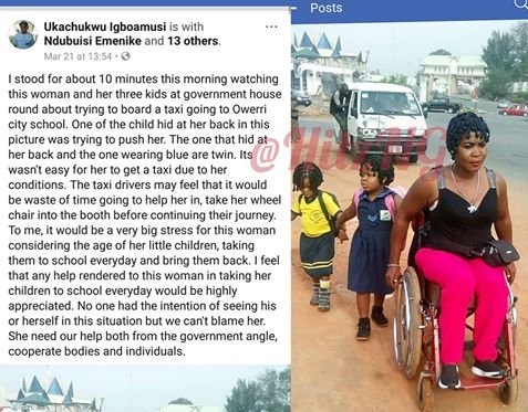According to a facebook user this handicapped Woman was spotted in owerri recently struggling to take her three children to school.