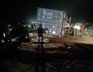 The crash was between a green Toyota Hiace bus with registration number: FGG88YG (Commercial) and unidentified driver a red Mercedes Truck with no registration number (commercial).