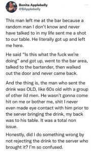 “This man left me at the bar because a random man I don’t know and never have talked to in my life sent me a shot to our table. He literally got up and left me here.