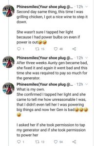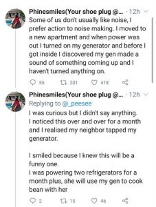She said she then called an electrician who confirmed her suspicion was right. So, she decided to pay her neighbour back in her own coin by pretending her generator was bad.