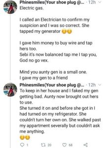 A woman took to Twitter to narrate how she dealt with her neighbour after she discovered she was tapping power from her generator without her approval.