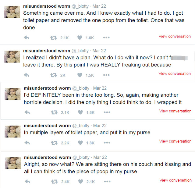 Getting to his house, she used the toilet but it wouldn’t flush properly which left her panicking. She then wrapped her poo in toilet paper and then put it in her handbag. At some point she even considered throwing it out of the window. The hilarious series of tweets have gone viral and have been retweeted thousands of times.