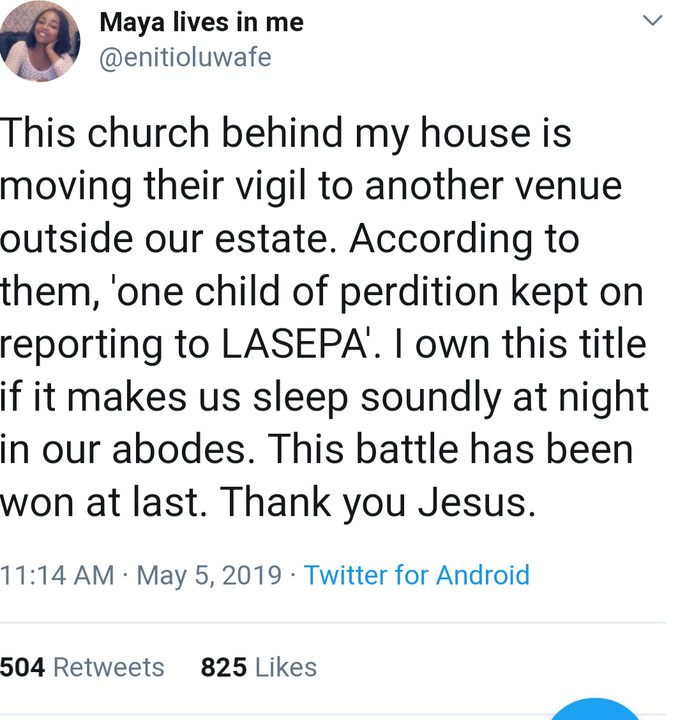 This church behind my house is moving their vigil to another venue outside our estate. According to them, ‘one child of perdition kept on reporting to LASEPA’. I own this title if it makes us sleep soundly at night in our abodes. This battle has been won at last. Thank you Jesus.