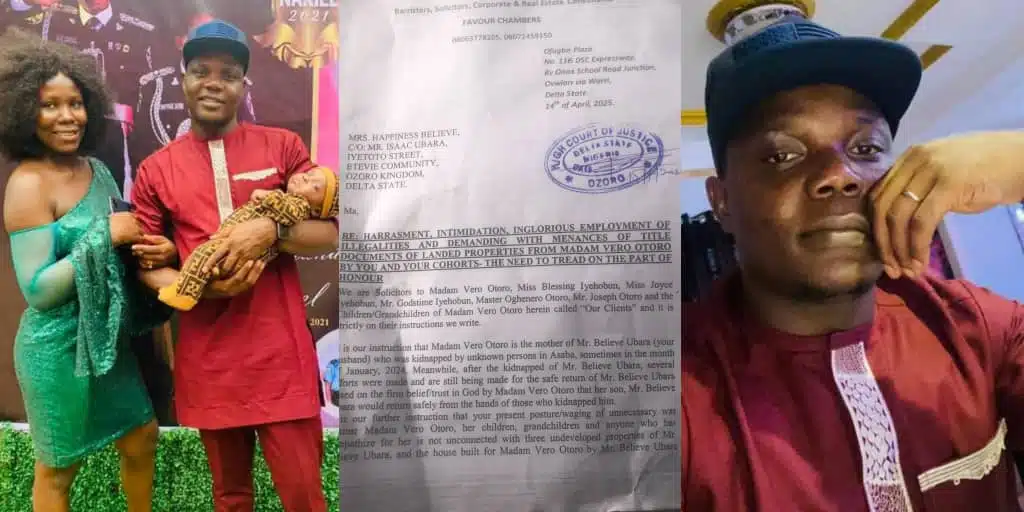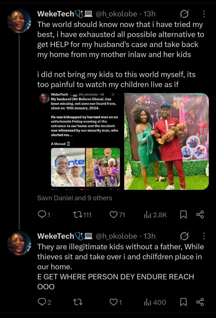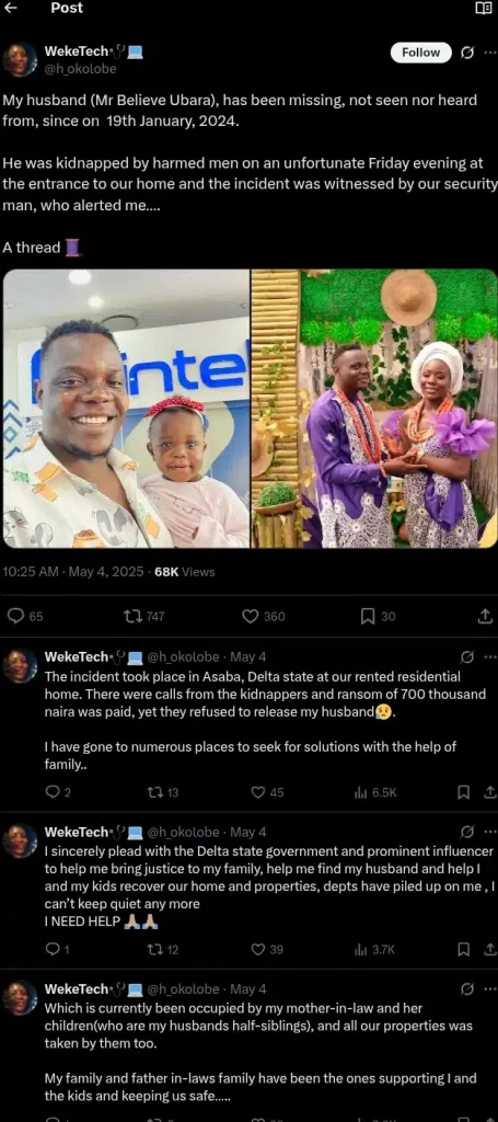The woman, who goes by the handle @h_okolobe on the platform X (formerly Twitter), revealed that her husband, Mr. Believe Ubara, has been missing since January 19, 2024, after reportedly being kidnapped at the entrance of their home in Asaba, Delta State.