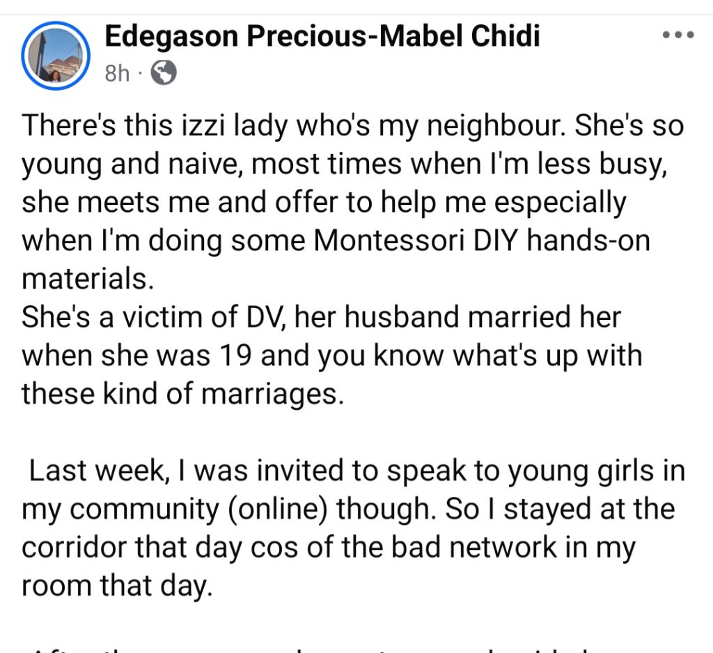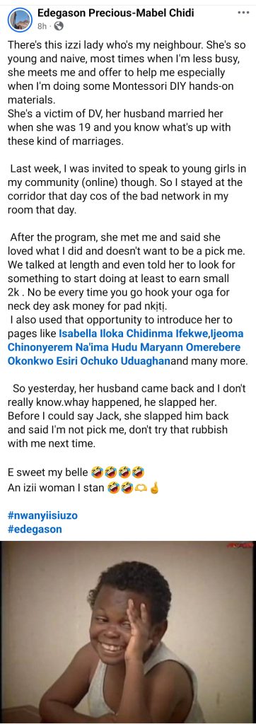 She added that after that conversation, she introduced her neighbour to the page of online feminists and asked her to follow them.