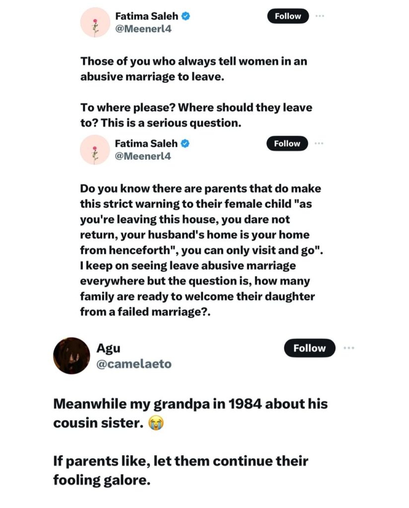 Some X users shared tales of women who are told as they are about getting married that they are not allowed to leave their matrimonial home under any circumstance.