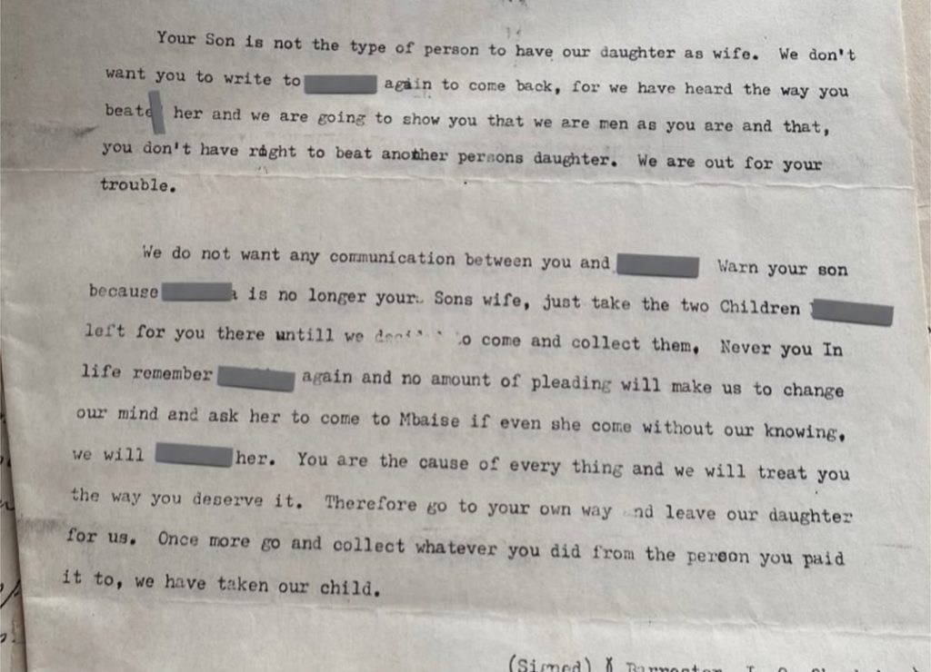 She proceeded to share the letter that her grandfather sent to his cousin’s abusive husband’s family when he tried to get his wife back after they separated over physical abuse.