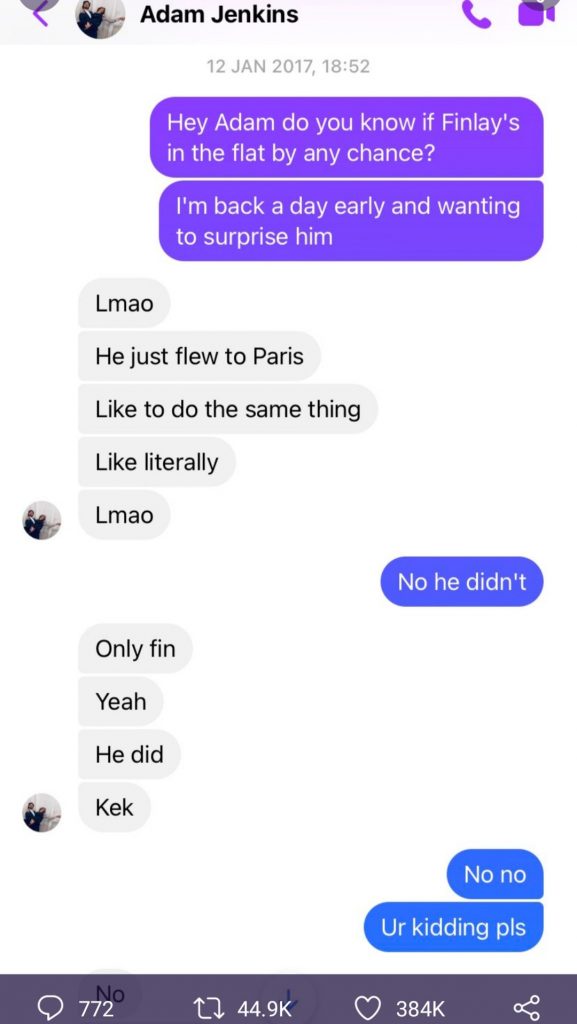 Sharing the screenshots, Salma wrote: “Happy 4 year anniversary to when I flew to Edinburgh to surprise Finlay and he flew to Paris to surprise me and this is why we don’t do surprises anymore.”